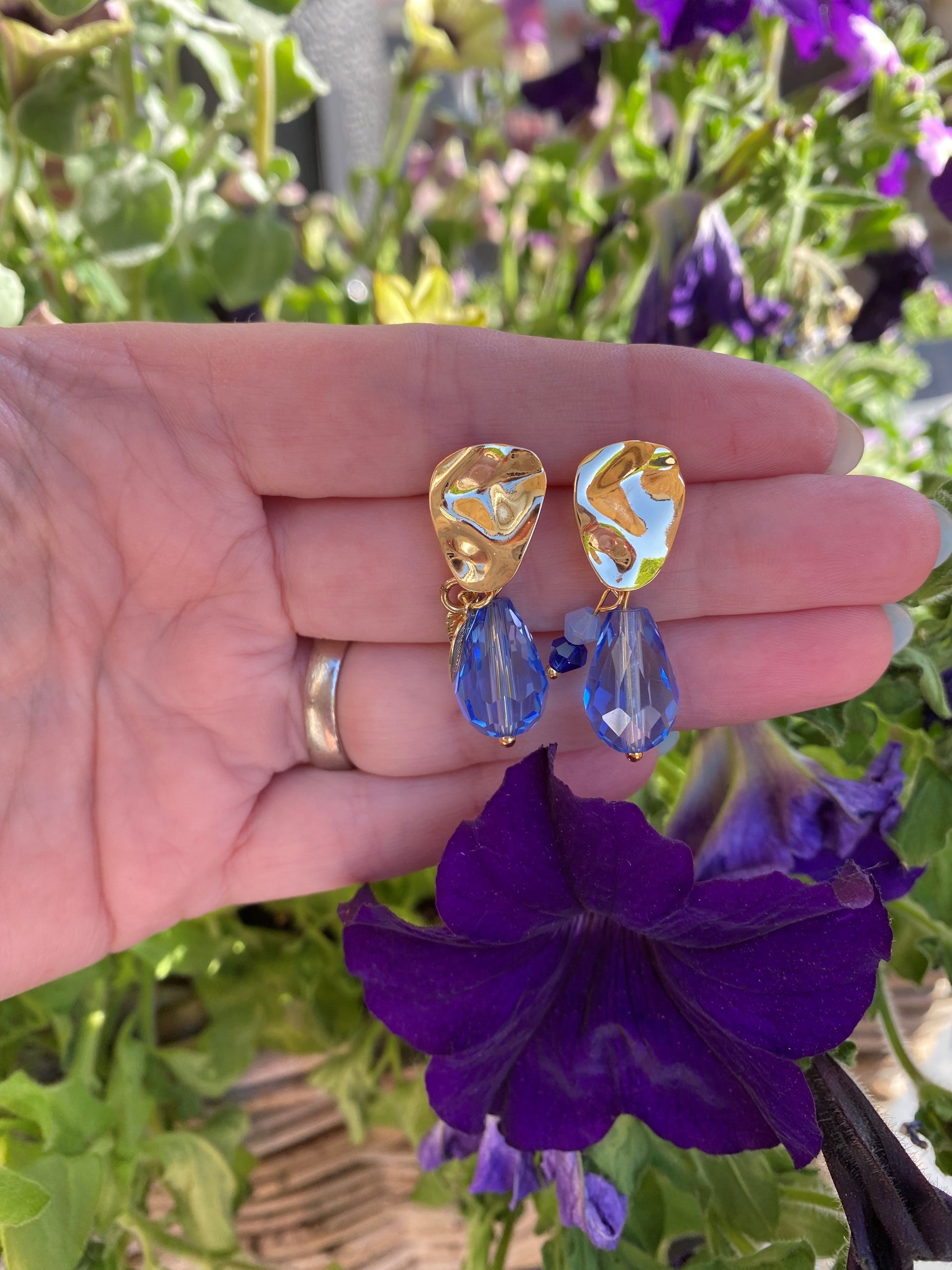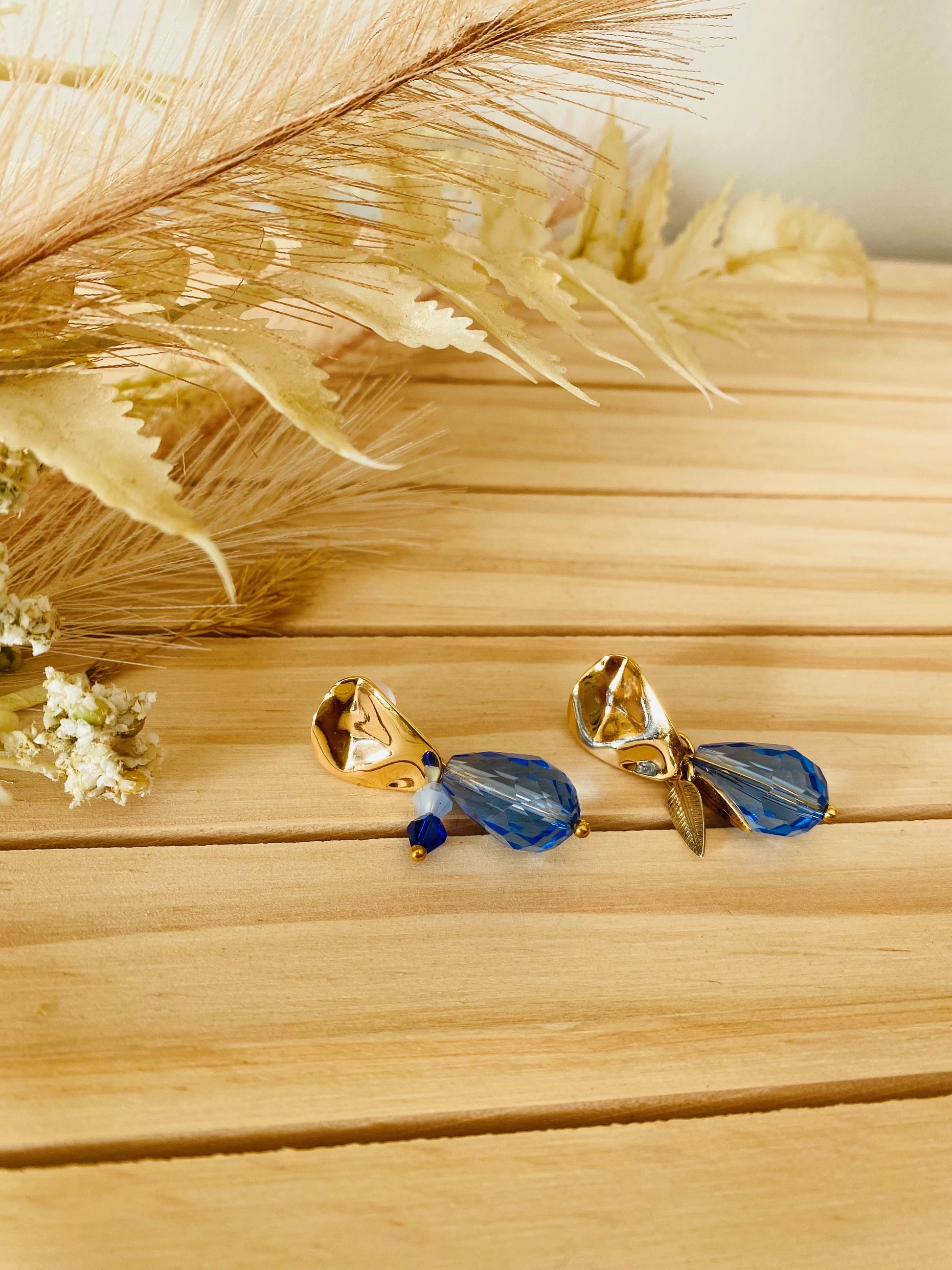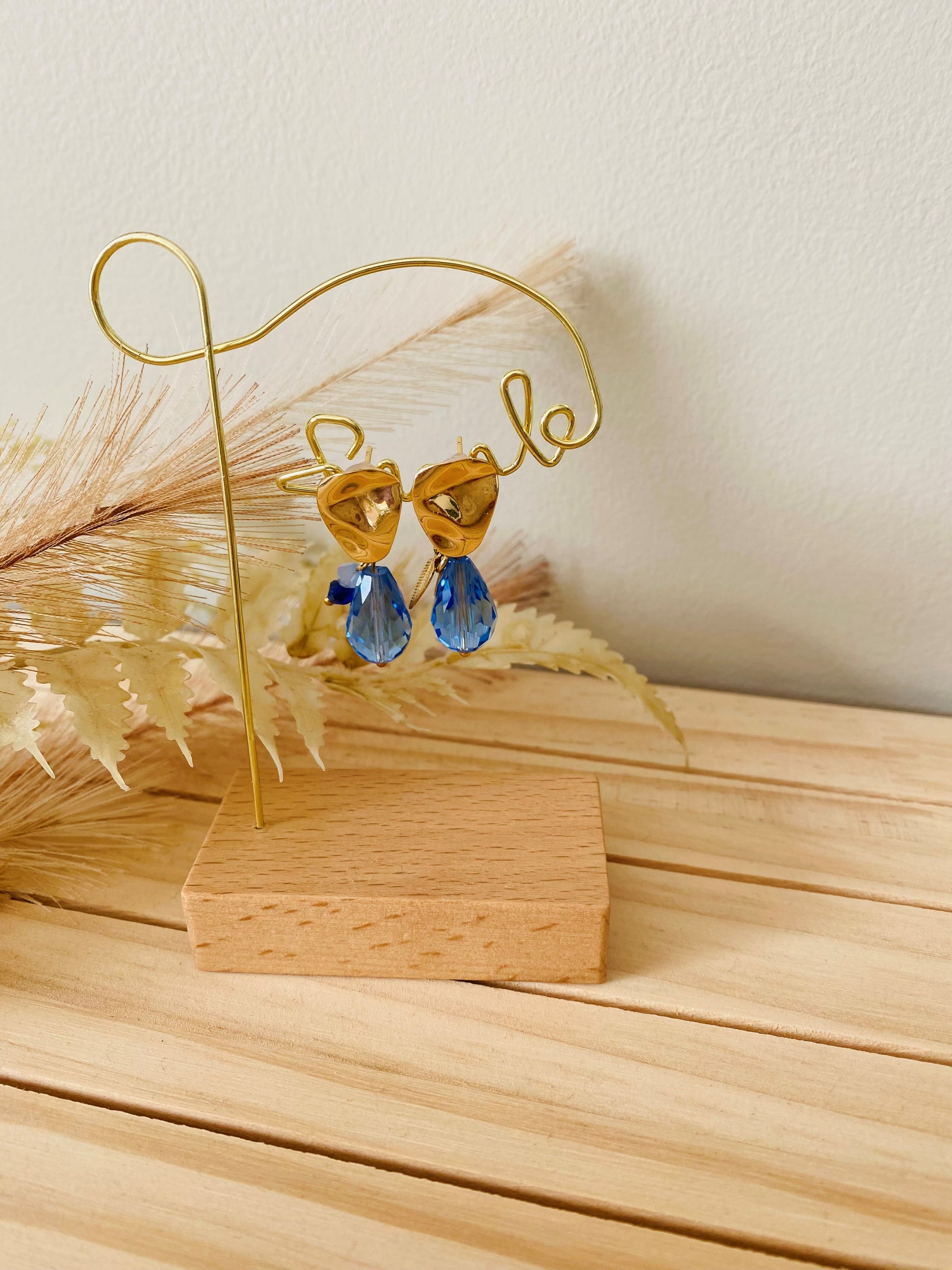 Laat je meevoeren op een zachte golf van elegantie en speelsheid. Deze oorbel combineert een verfijnde gouden steker met een golvend ontwerp en een doorschijnende blauwe hanger die doet denken aan het kalme, kabbelende water van de zee.