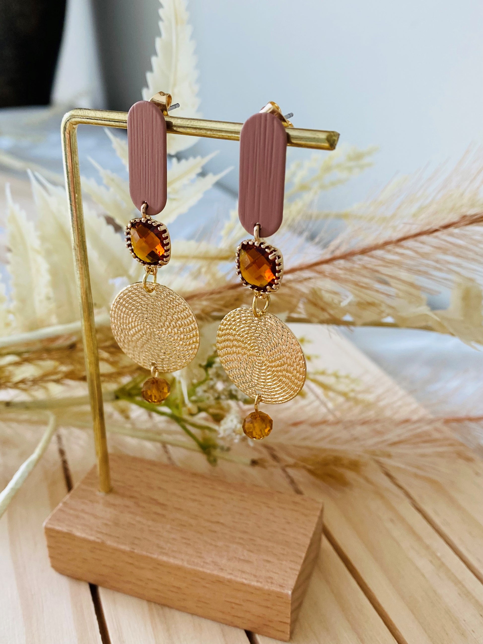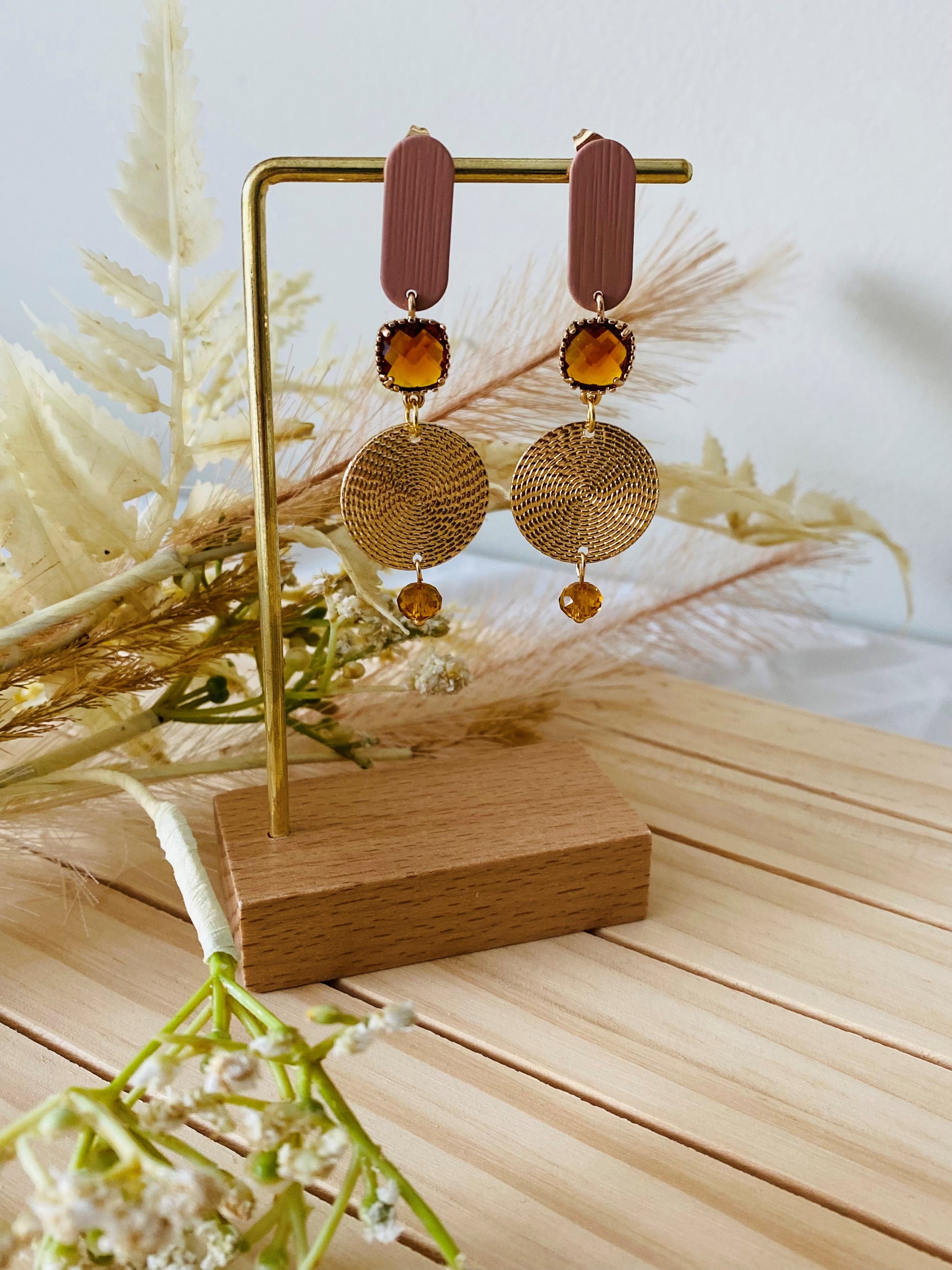 Warme tinten en organische elegantie komen samen in deze unieke oorringen. De diepe bruine steker vormt een natuurlijke basis voor de amberkleurige stenen, die zacht oplichten bij elke beweging. Gouden accenten zorgen voor een subtiele glans die perfect past bij de rijke aardetonen.