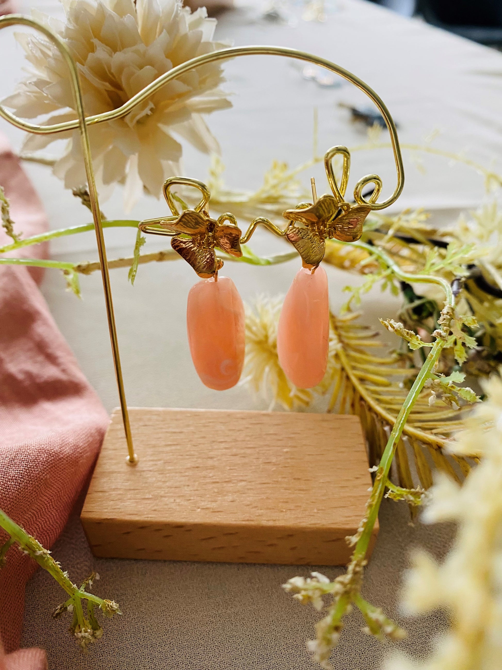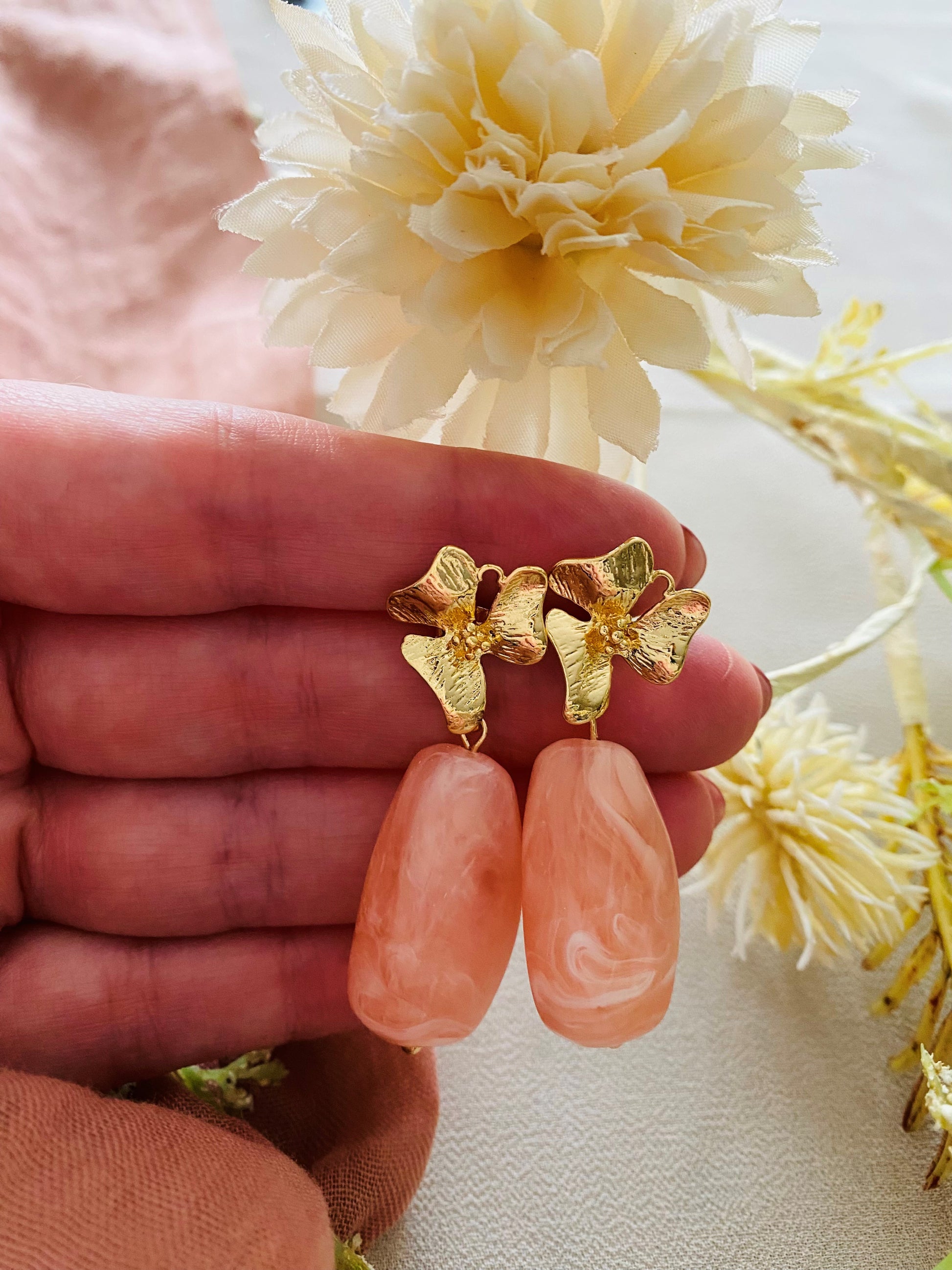 Laat je betoveren door de subtiele elegantie van deze 18K gold plated oorringen. De delicate bloemsteker straalt verfijning uit, terwijl de zalmkleurige steenhanger zorgt voor een zachte, vrouwelijke touch. Perfect om elke look een vleugje luxe en zachtheid te geven — van een zomerse dagjurk tot een chique avondoutfit.