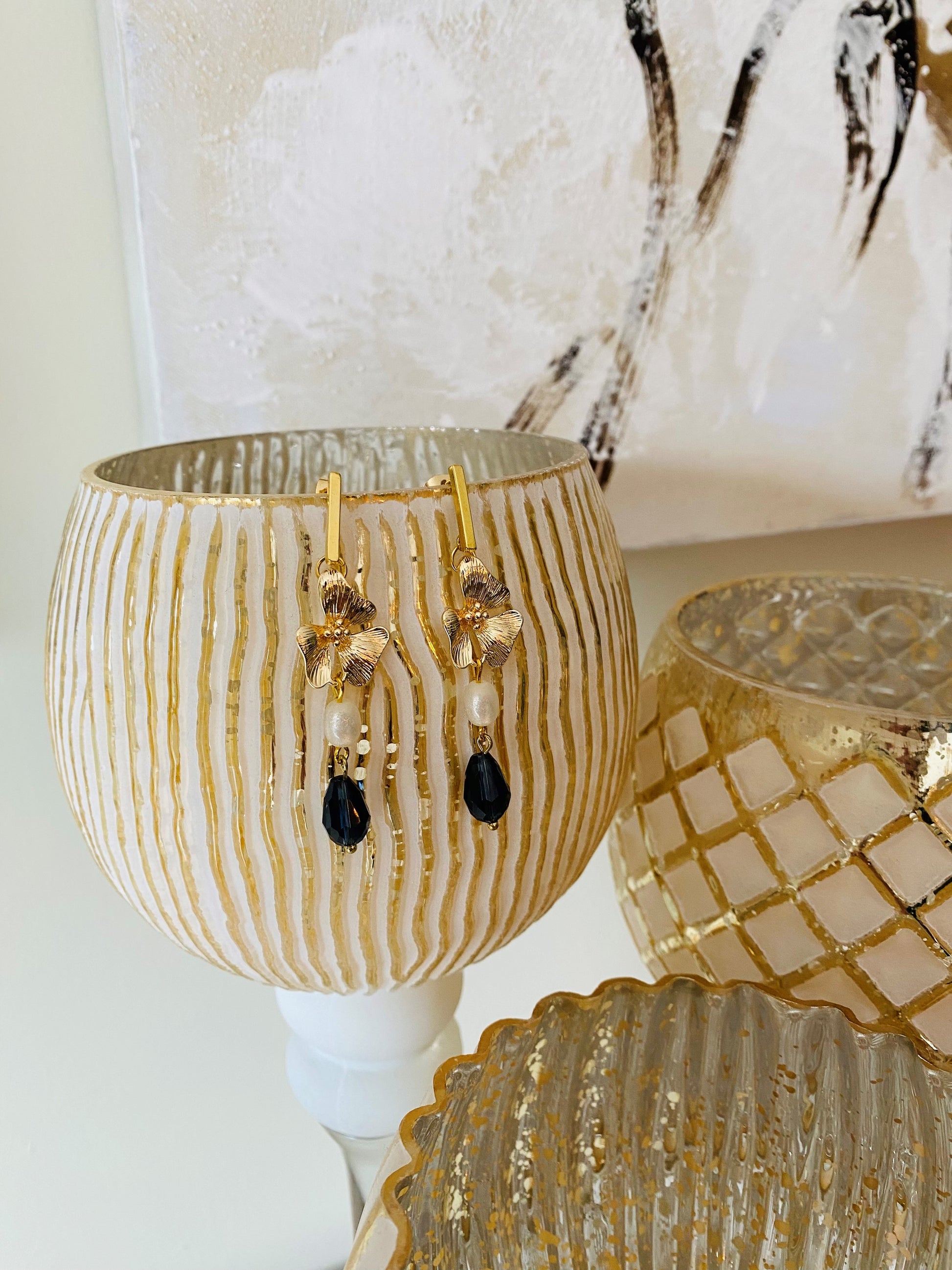 Stralend en verfijnd – deze oorringen combineren tijdloze elegantie met een vleugje moderne charme. De korte staafsteker zorgt voor een subtiele, stijlvolle look, terwijl het gouden bloemaccent een vleugje luxe toevoegt. De witte en blauwe parels vangen het licht op een zachte, dromerige manier – perfect voor elke gelegenheid, van een zomerse dag tot een avond vol glamour.