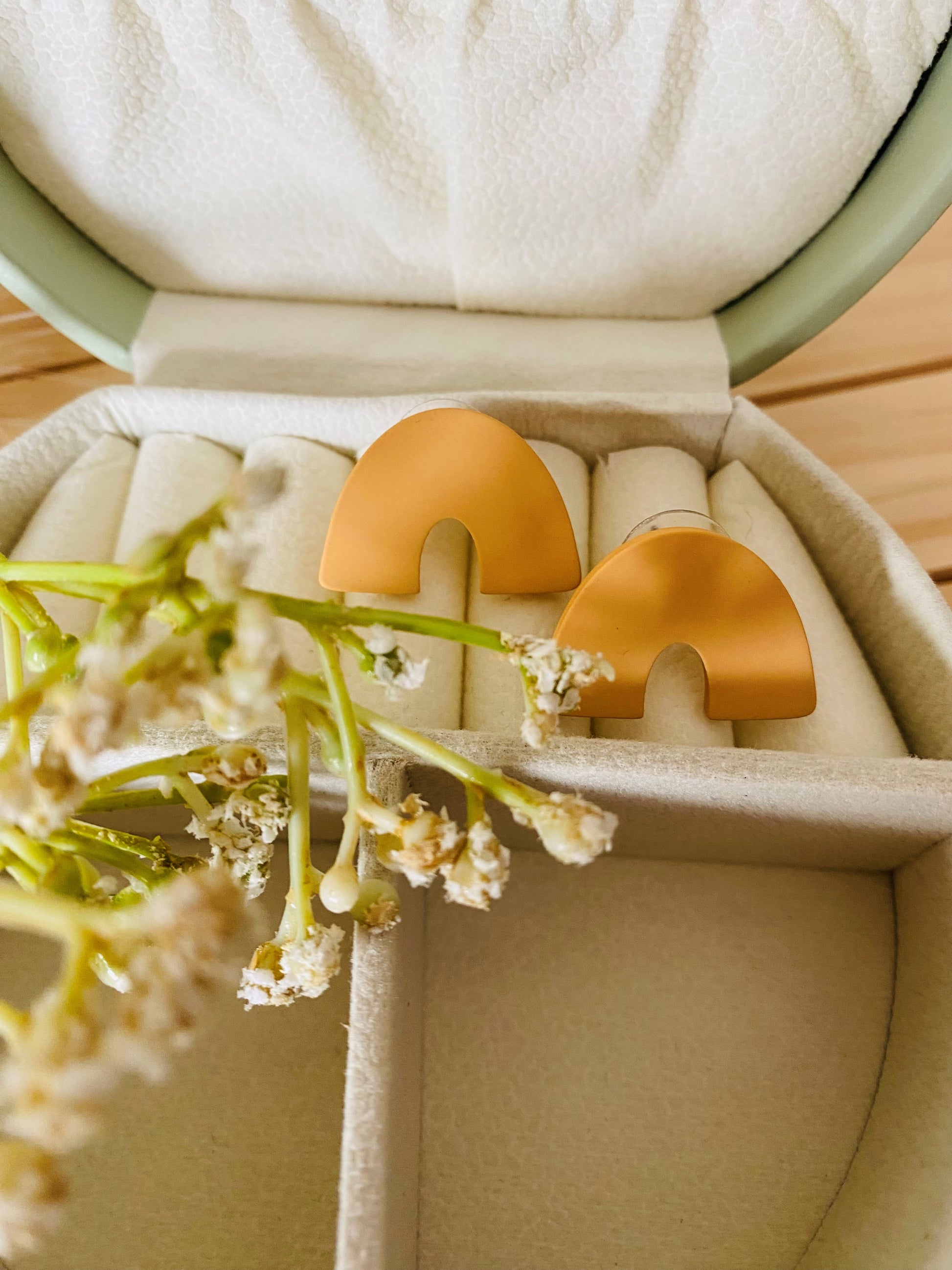 De omgekeerde halvemaanvorm in warme bruine tint met subtiele zwarte accenten creëert een unieke balans tussen zachtheid en contrast. Een eigentijds ontwerp dat opvalt door eenvoud — perfect voor wie houdt van natuurlijke kleuren met een grafische twist.