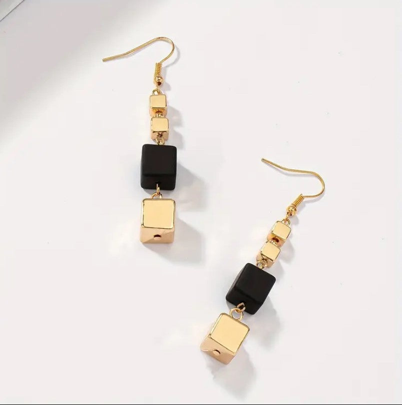 Minimalistisch en toch opvallend: deze oorringen combineren gouden vierkante blokjes met zwarte accenten in een strak ritme. Het contrast tussen goud en zwart geeft een krachtige, moderne uitstraling — perfect voor wie houdt van geometrie, elegantie en een tikje edge.