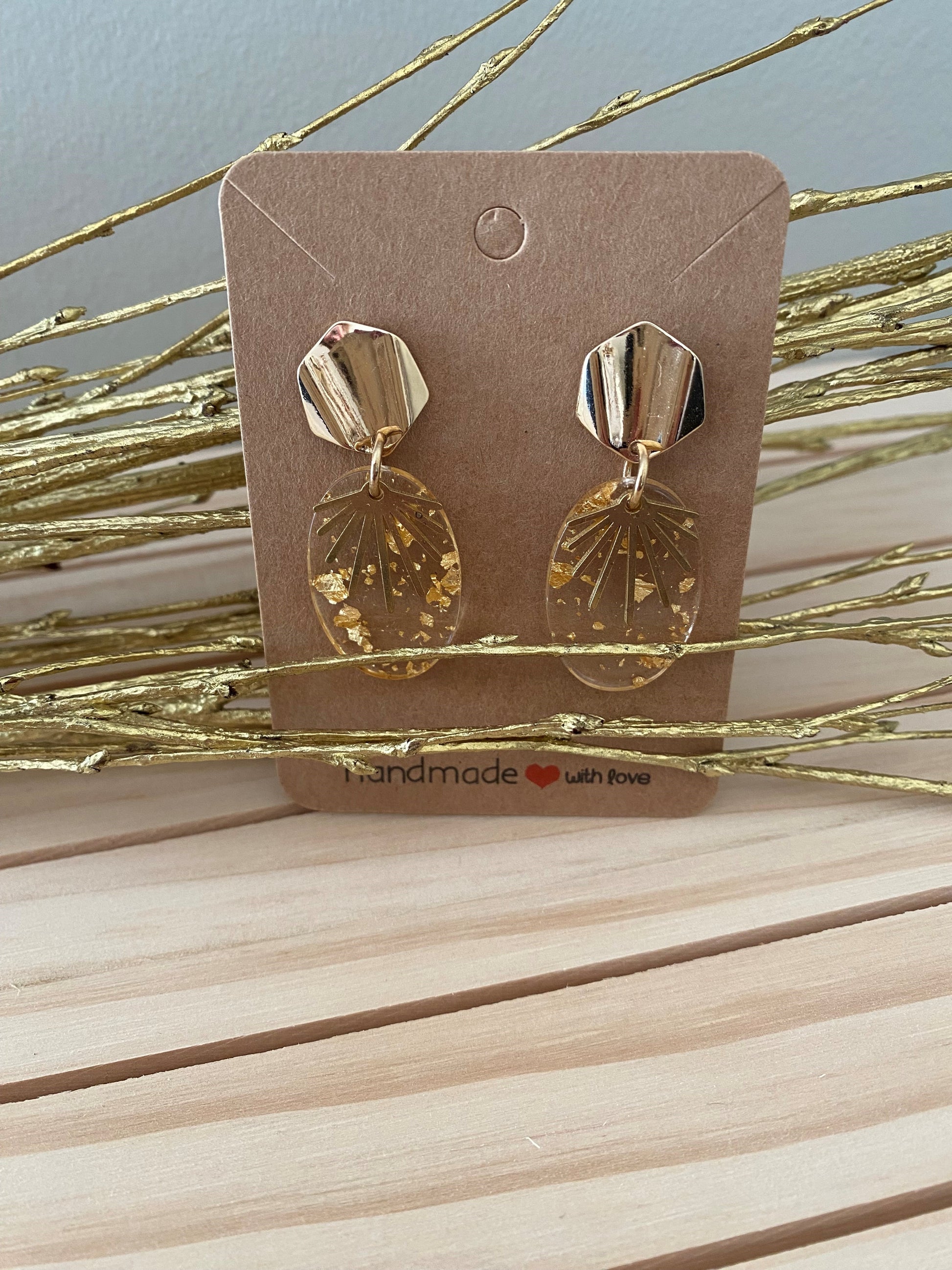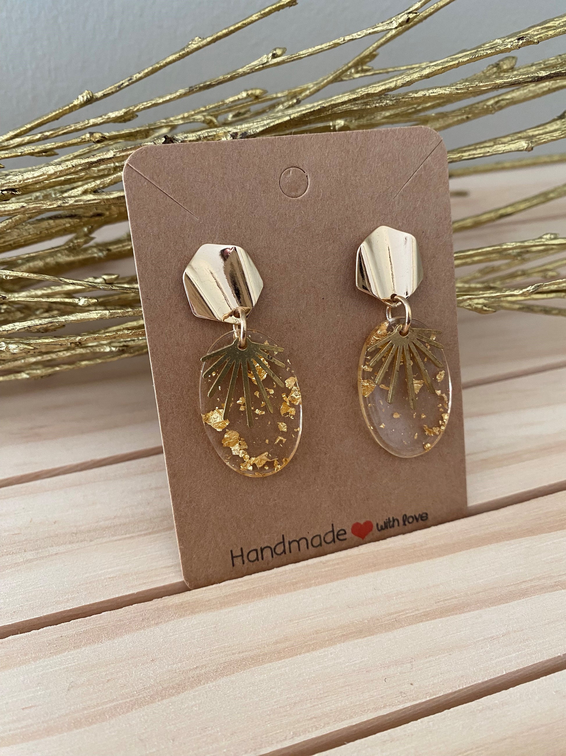 Deze betoverende gouden wave-stekers combineren modern design met een vleugje luxe. De doorzichtige hangers zijn gevuld met schitterend bladgoud, waardoor ze bij elke beweging licht vangen en subtiel fonkelen. Het golvende ontwerp van de stekers symboliseert elegantie en beweging, terwijl de gouden accenten de oorbellen een verfijnde, luxueuze uitstraling geven. Perfect om een minimalistische look te verfraaien of een glamoureus statement te maken, deze oorbellen stralen tijdloze charme en verfijning uit.