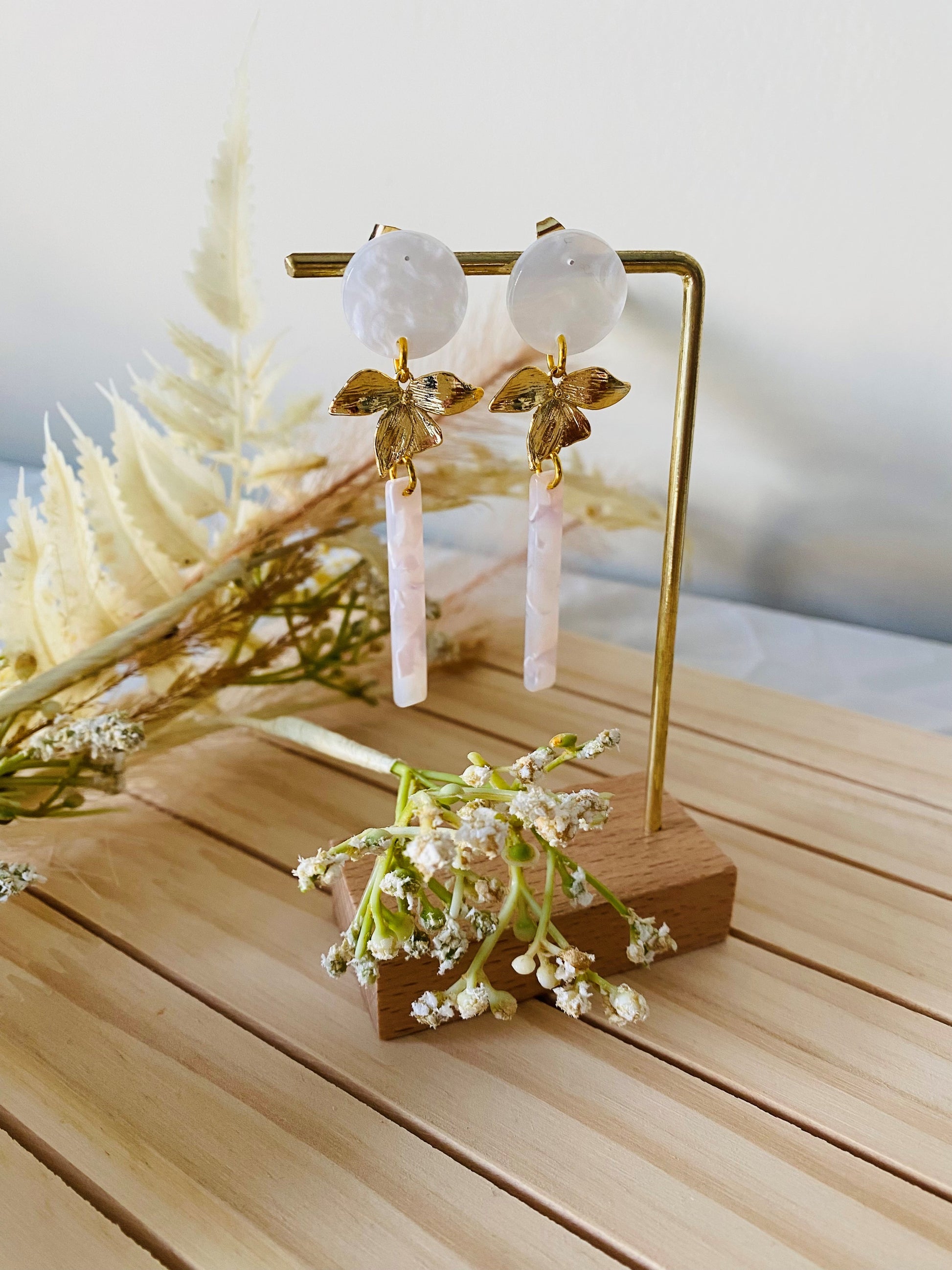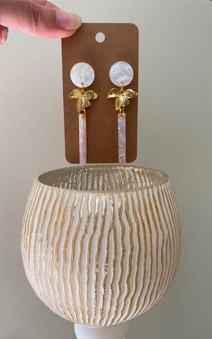 Deze stijlvolle oorstekers combineren een zachte witte resin basis met een verfijnde gouden bloem en een strakke, witte staafvormige hanger. De combinatie van vloeiende lijnen en subtiele kleuren maakt dit ontwerp zowel modern als romantisch