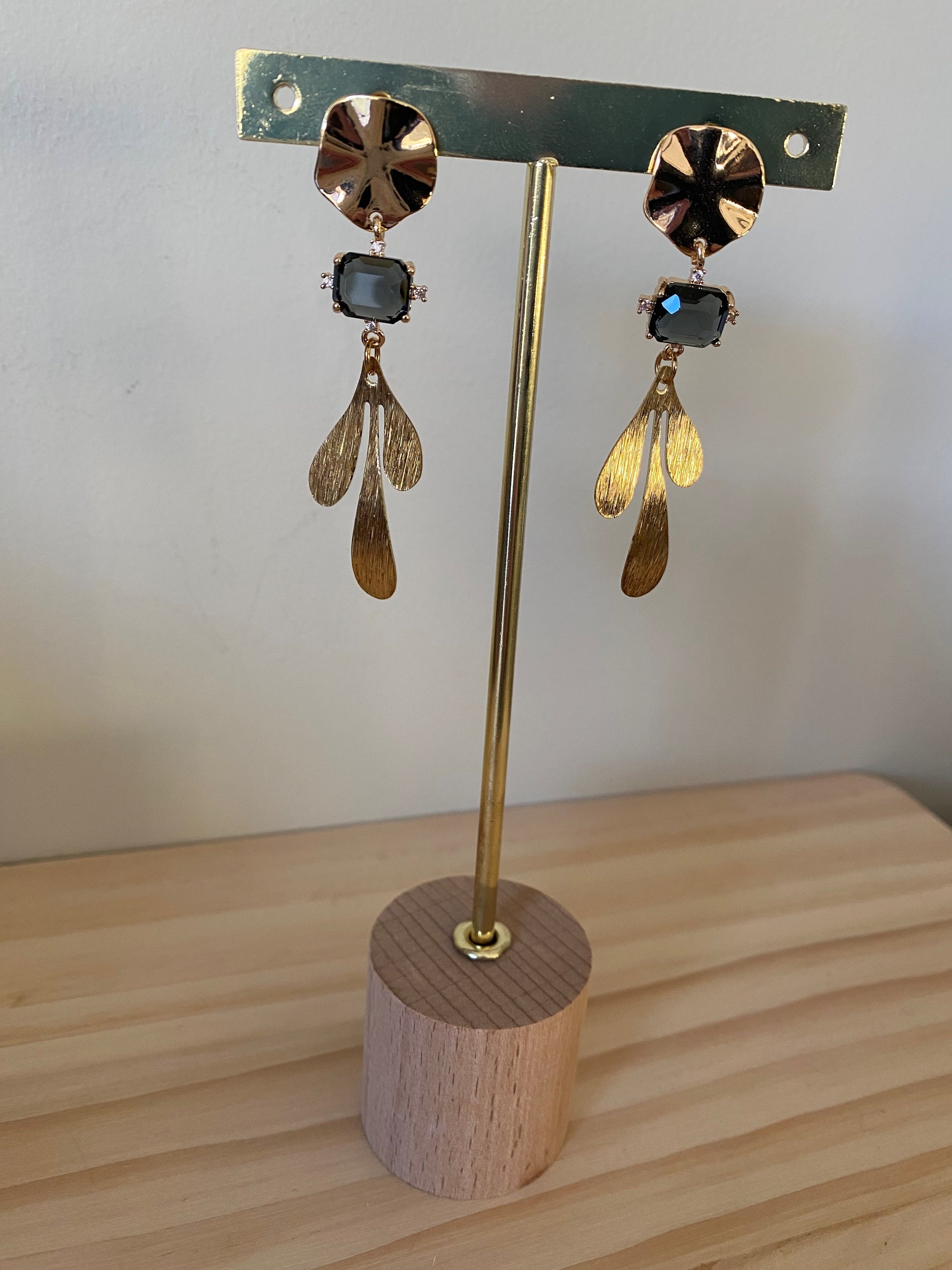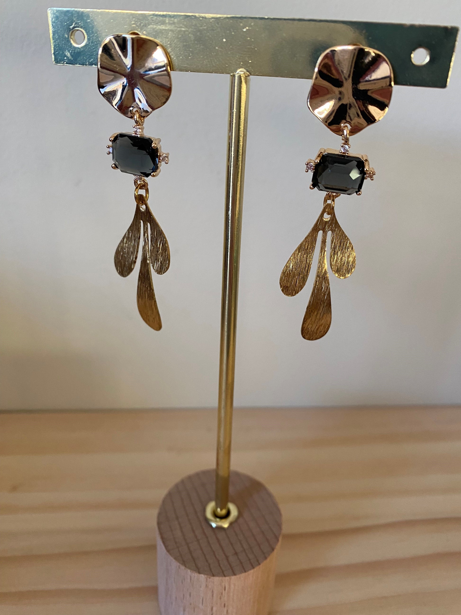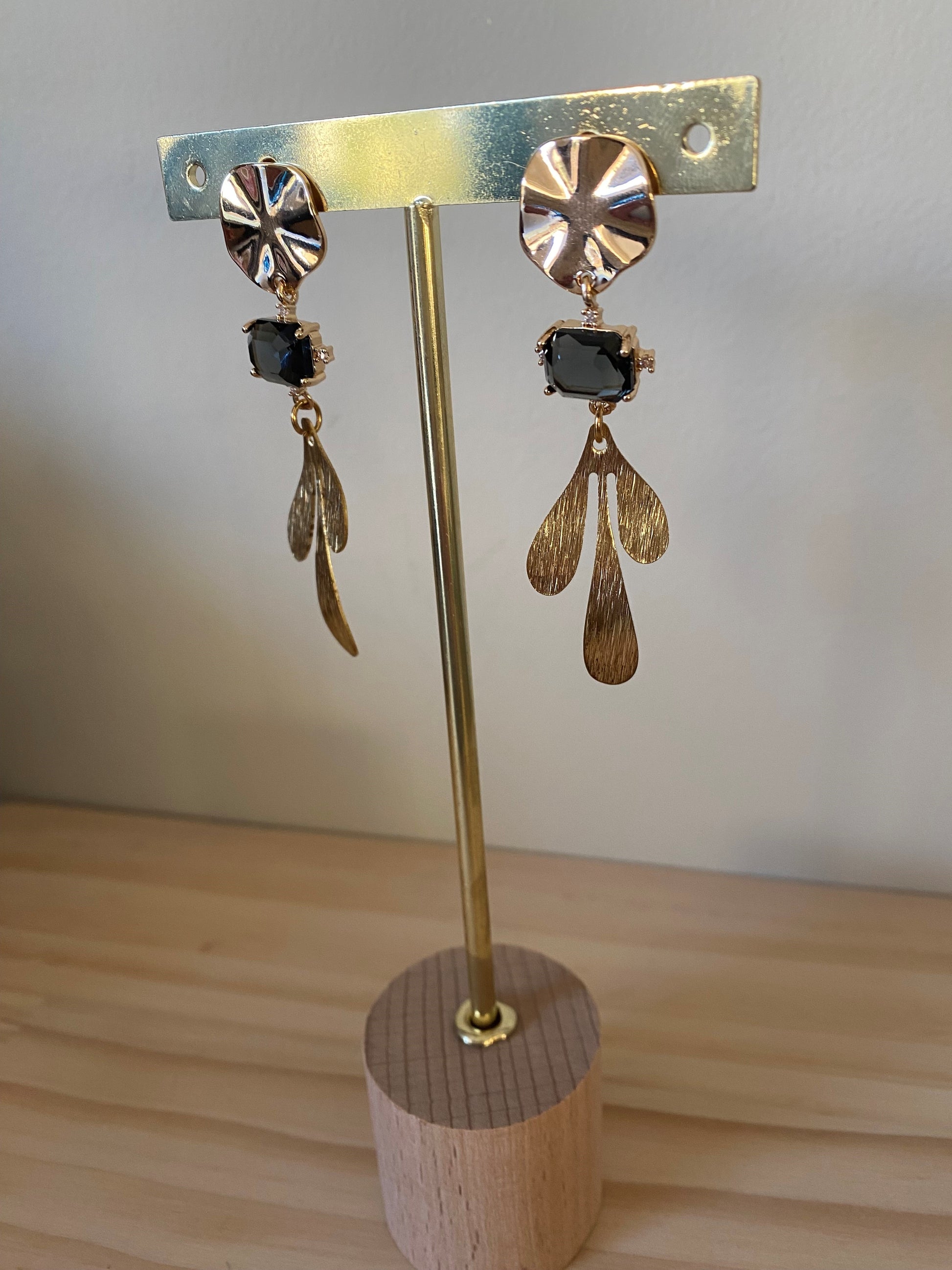 Deze verfijnde oorringen combineren warme gouden ringen met diepe zwarte steenhangers en subtiele gouden accenten. Het contrast tussen het matte zwart en het glanzende goud geeft een moderne, chique uitstraling, terwijl het elegante ontwerp een luxueuze touch toevoegt aan elke look. Perfect voor wie houdt van een tijdloos en opvallend statement.