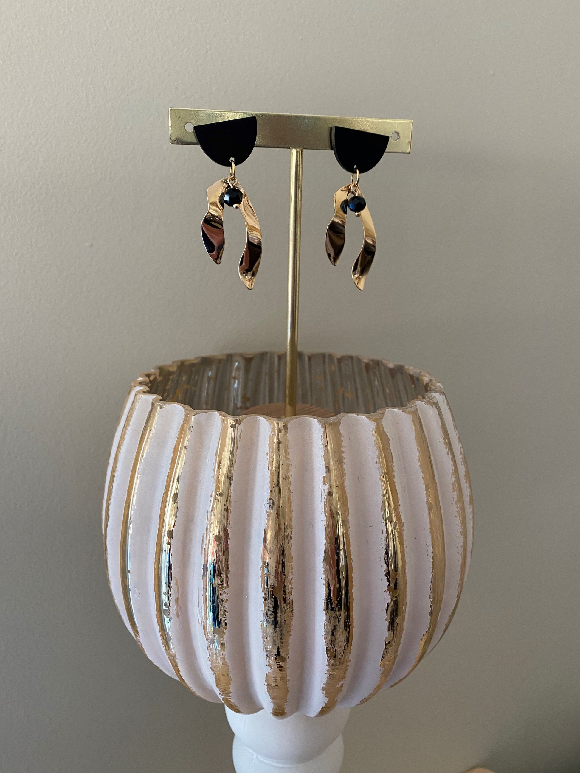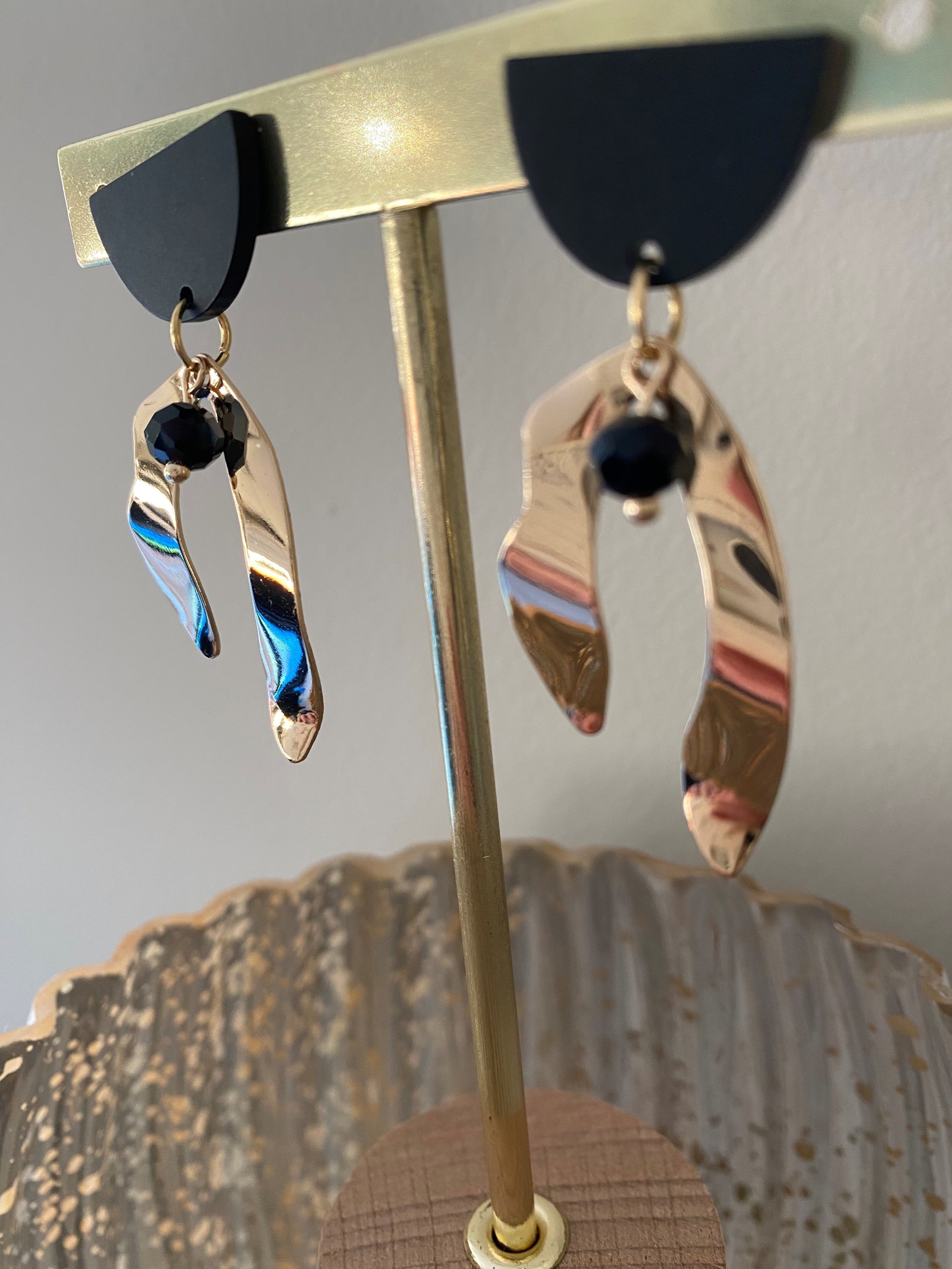 Deze verfijnde oorringen combineren een zwarte steker met subtiele gouden accenten en een elegante hanger voor een chique en moderne uitstraling. Het contrast tussen diep zwart en warm goud geeft een tijdloze luxe look, terwijl de hanger een speels en vrouwelijk detail toevoegt. Perfect voor wie houdt van een stijlvolle, eigentijdse touch bij elke outfit.