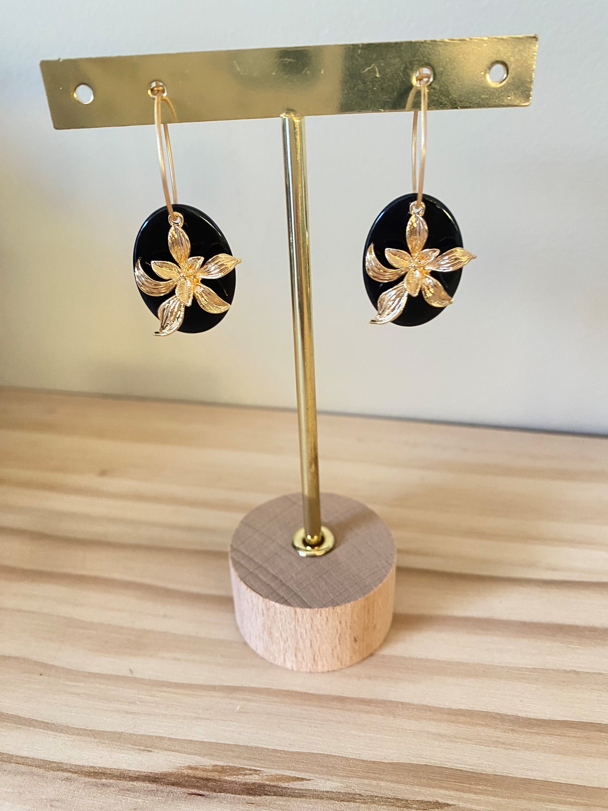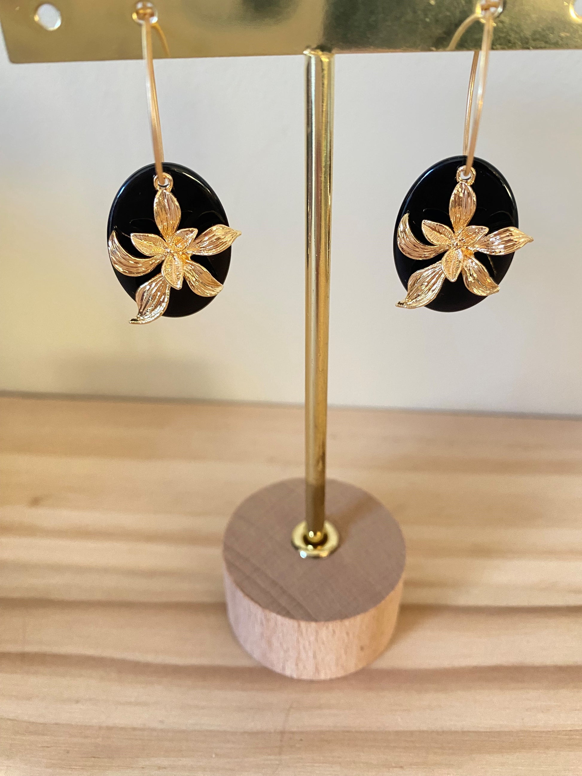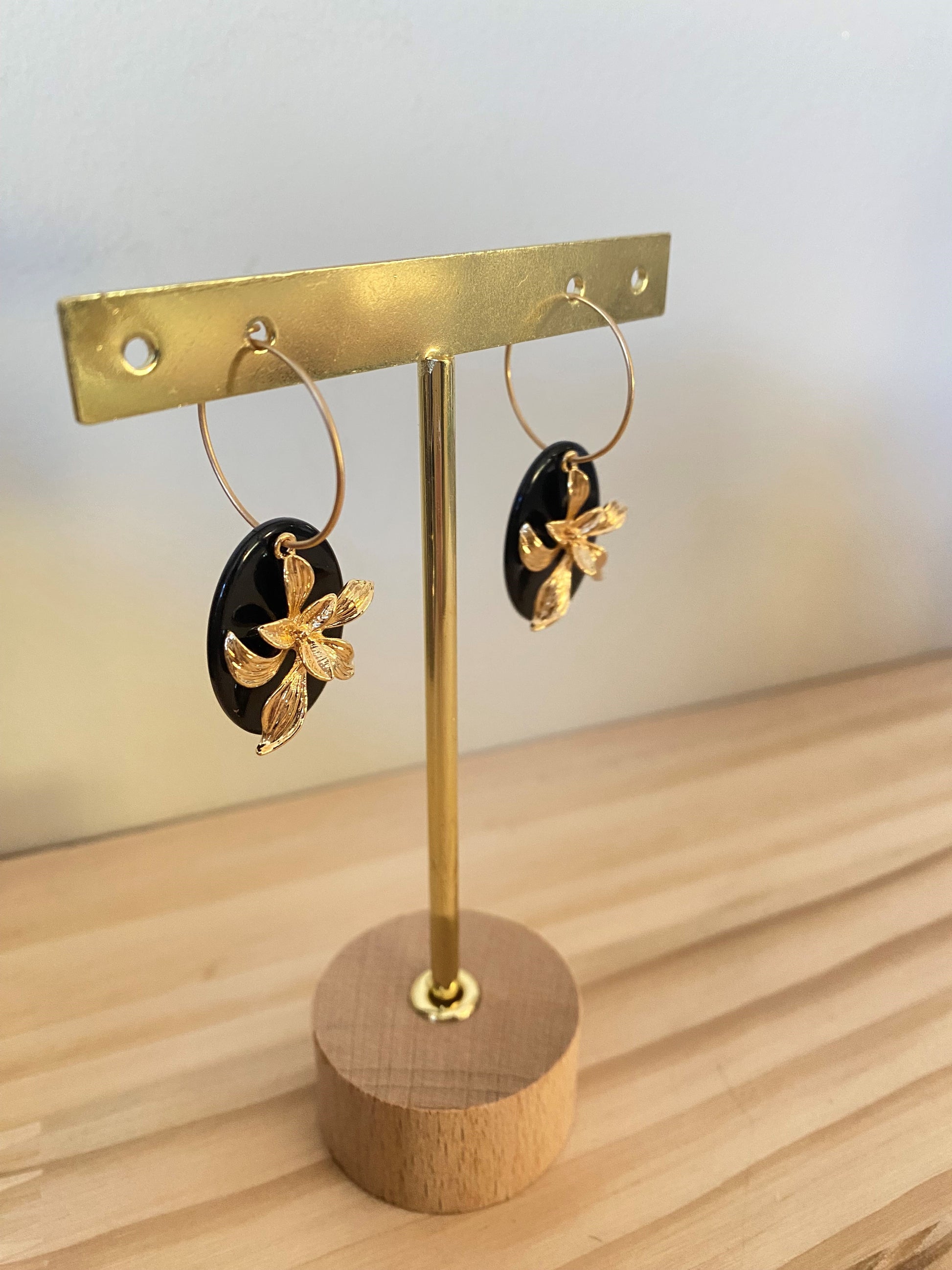 Deze elegante oorringen combineren matte gouden hoops met verfijnde zwarte accenten en een subtiele gouden bloem als blikvanger. Het contrast tussen mat goud en diep zwart zorgt voor een chique, moderne uitstraling, terwijl de bloemvorm een vrouwelijke en sierlijke touch toevoegt. Een tijdloos ontwerp dat moeiteloos luxe en karakter uitstraalt en elke outfit verfijnt, van dagelijks tot avondlook.