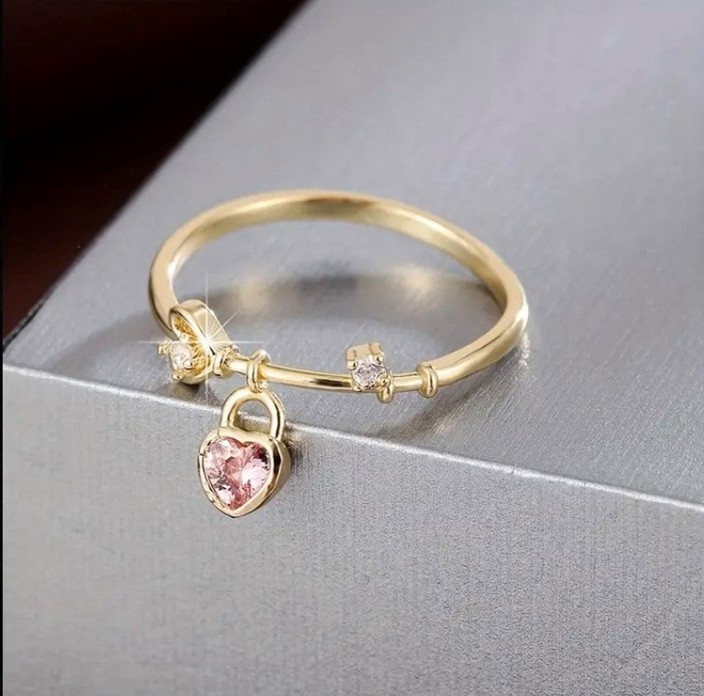 Deze fijne ring is versierd met een sierlijk harthangertje, bezet met een fonkelende roze zirkoniasteen. Het hart beweegt zachtjes mee met elke handbeweging — een speels en teder detail dat je look een vleugje romantiek geeft.