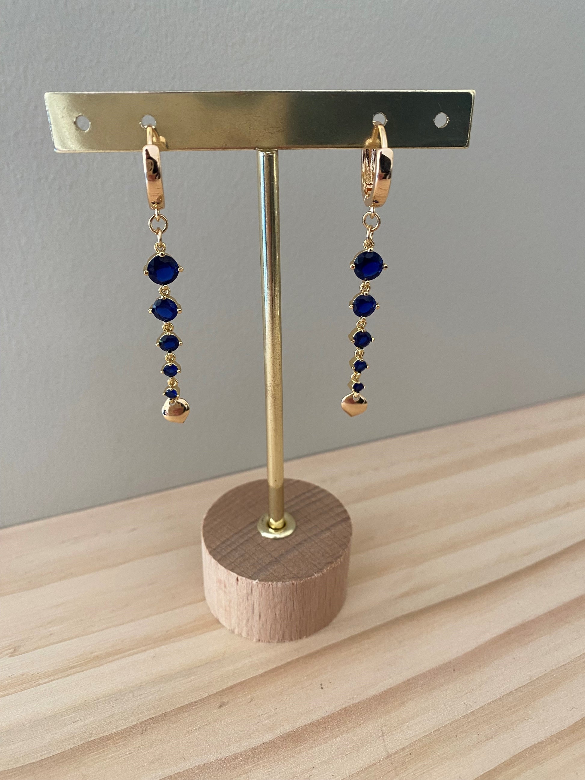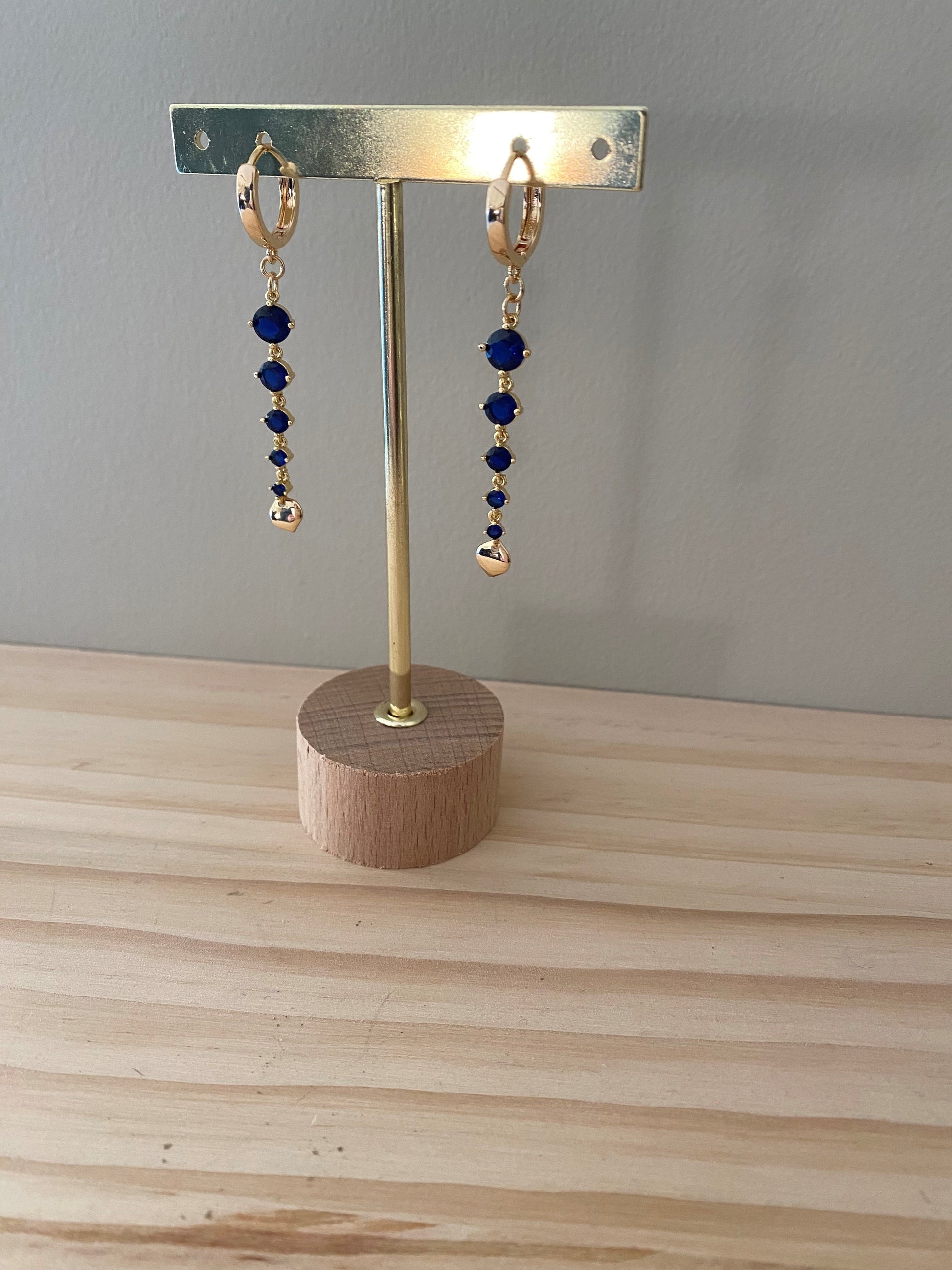 Deze fijne ronde hoops combineren subtiel vakmanschap met een vleugje luxe. Aan de oorringen hangt een diepblauwe stenenhanger, die prachtig contrasteert met het gouden bladaccent en het ontwerp een natuurlijke elegantie geeft. De combinatie van het rijke blauw en het warme goud zorgt voor een tijdloze uitstraling die zowel overdag als bij speciale gelegenheden schittert.