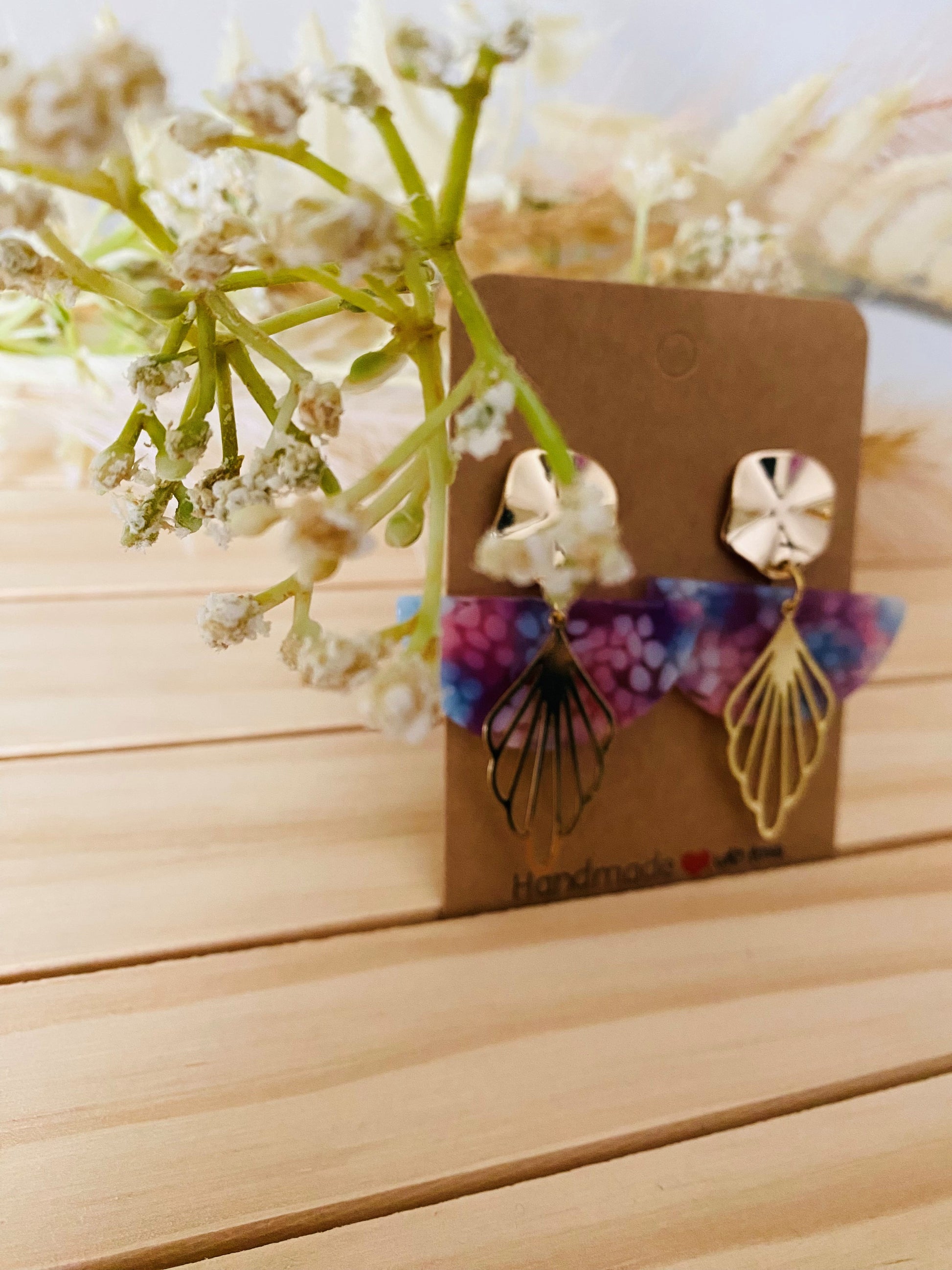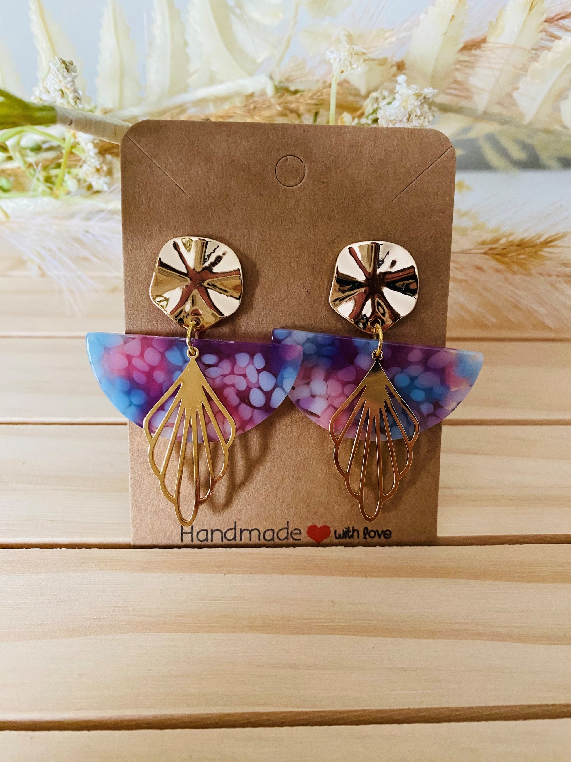 Een subtiel samenspel van vorm, kleur en glans. De golvende 18K gold plated steker vloeit elegant over in een halvemaanvormige hanger in zachte paarse tinten, afgewerkt met een verfijnde gouden accenthanger. Een harmonieuze mix van beweging en balans — perfect voor wie houdt van tijdloze elegantie met een moderne twist.