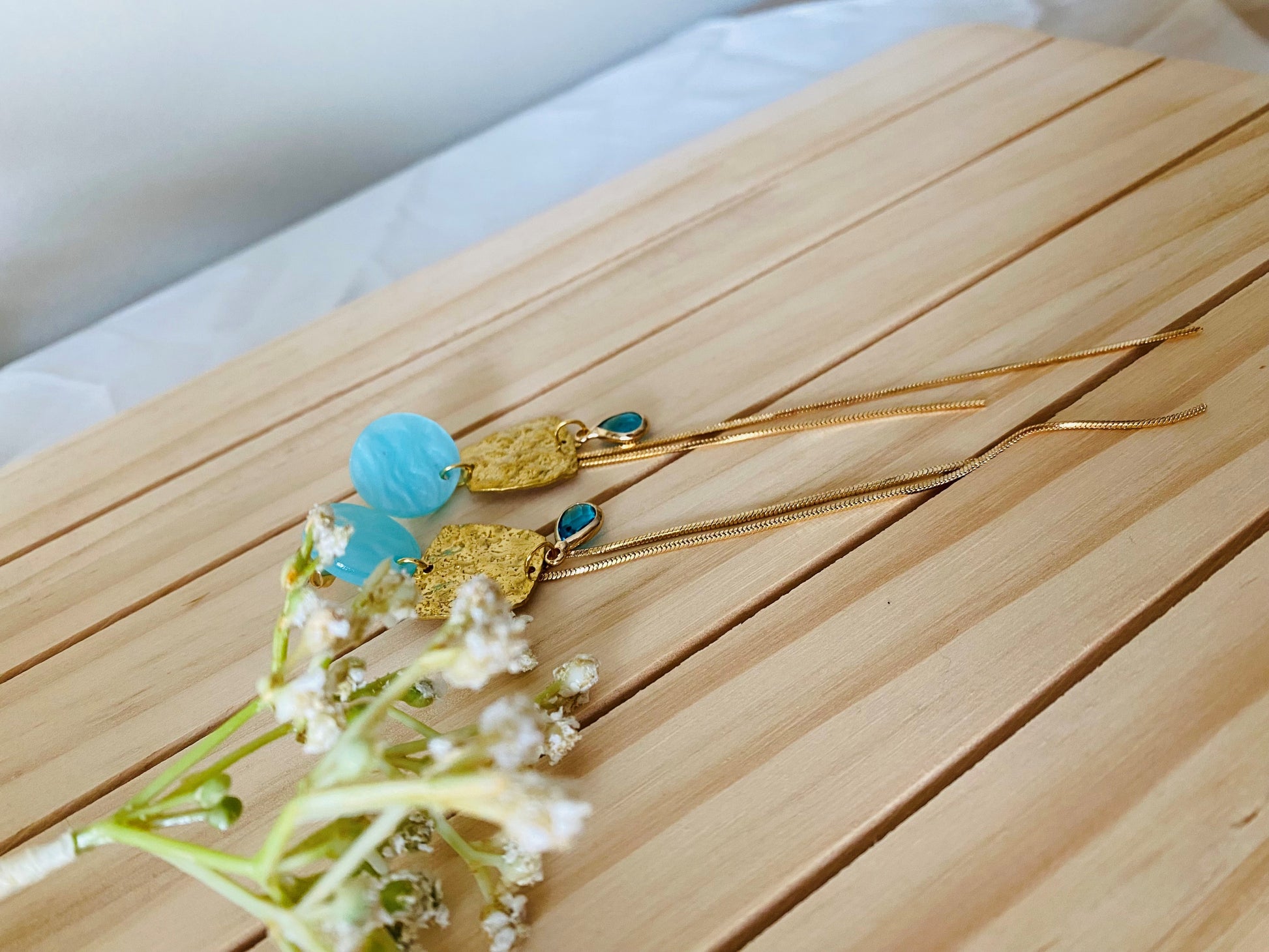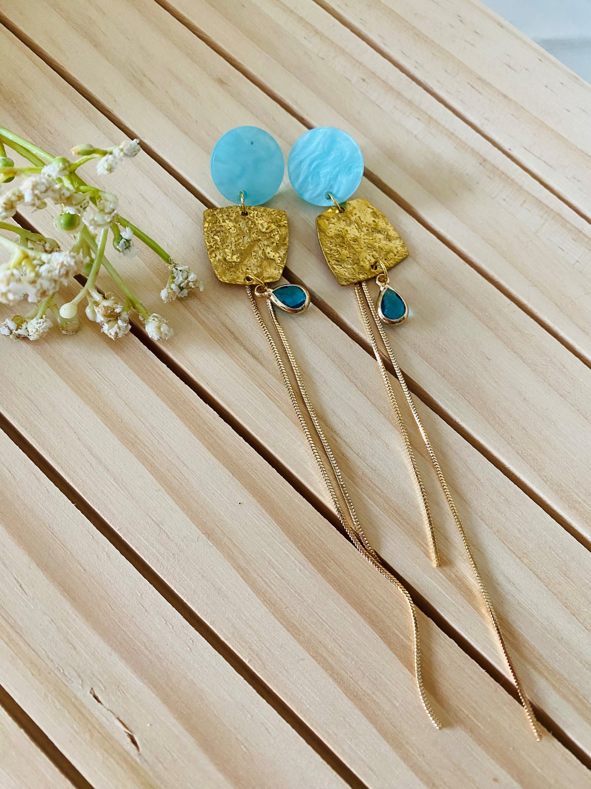 De harmonieuze combinatie van koelblauw en warm goud maakt deze oorbellen veelzijdig en tijdloos — perfect voor zowel een stijlvolle werkdag als een avondlook. Licht, speels en toch onmiskenbaar chic.