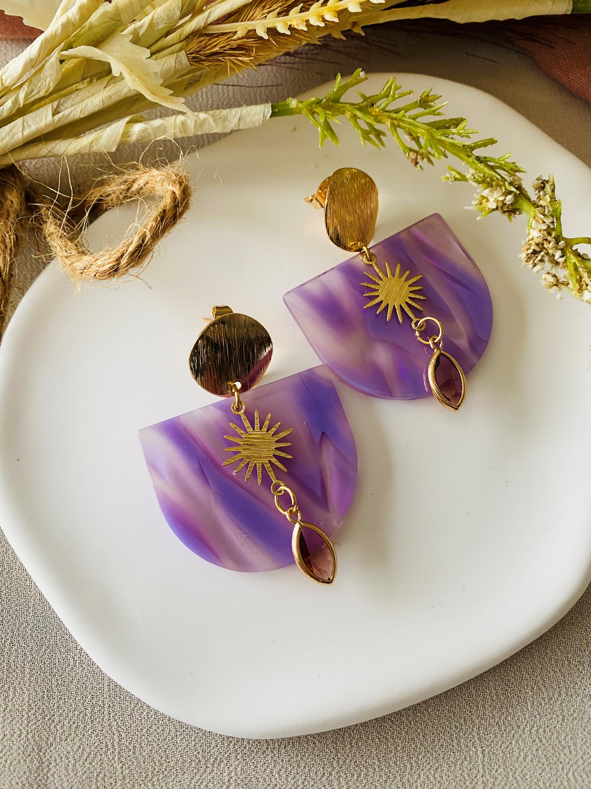 Luxueus, opvallend en mystiek - deze oorbel combineert een 18K gouden steker met een grote doorschijnende paarse hanger, een fonkelend gouden zonaccent en een kleine dieppaarse ovale hanger. Het speelse kleurenspel van paars en goud creëert een elegant en eigentijds statement, perfect om een outfit een verfijnde en stijlvolle touch te geven.