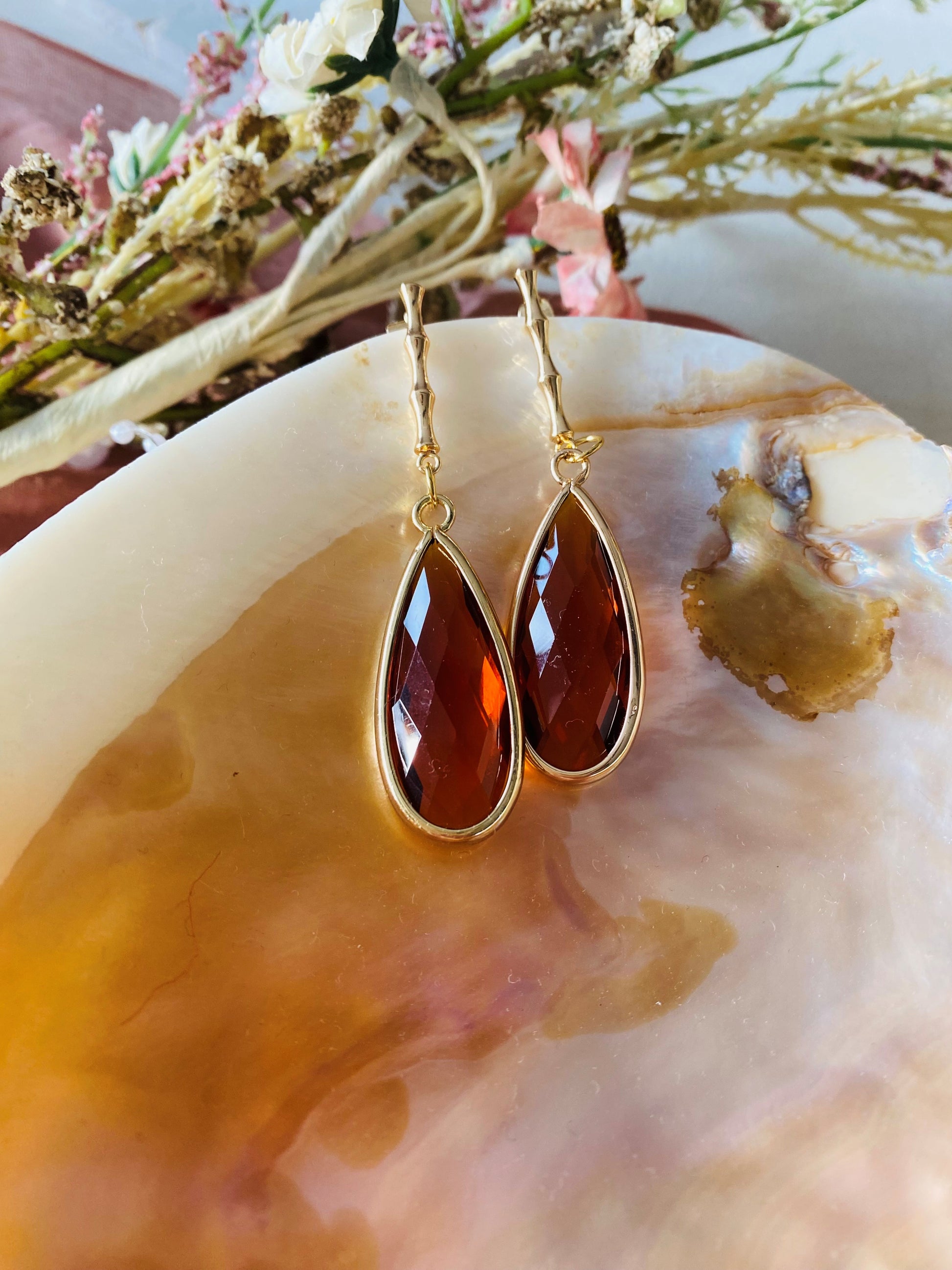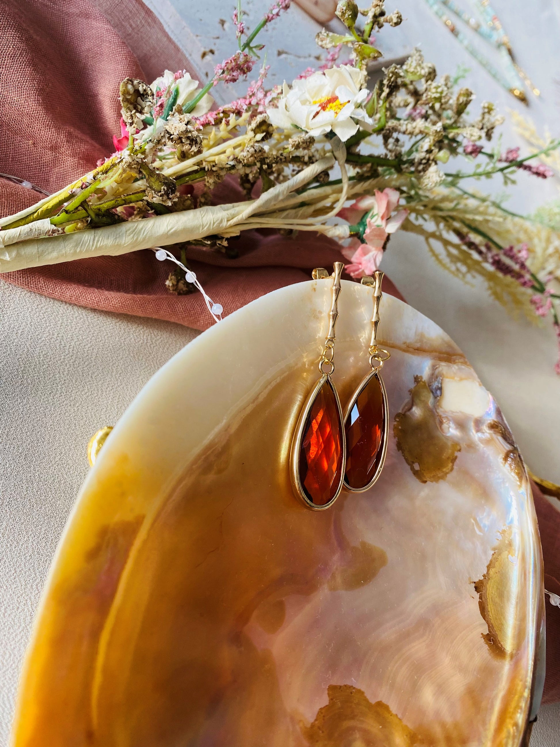 Goud en amber, in een strakke vorm. Deze lange oorringen combineren een geribbelde steker met een glanzende, druppelvormige hanger. Licht, elegant en opvallend in alle eenvoud.