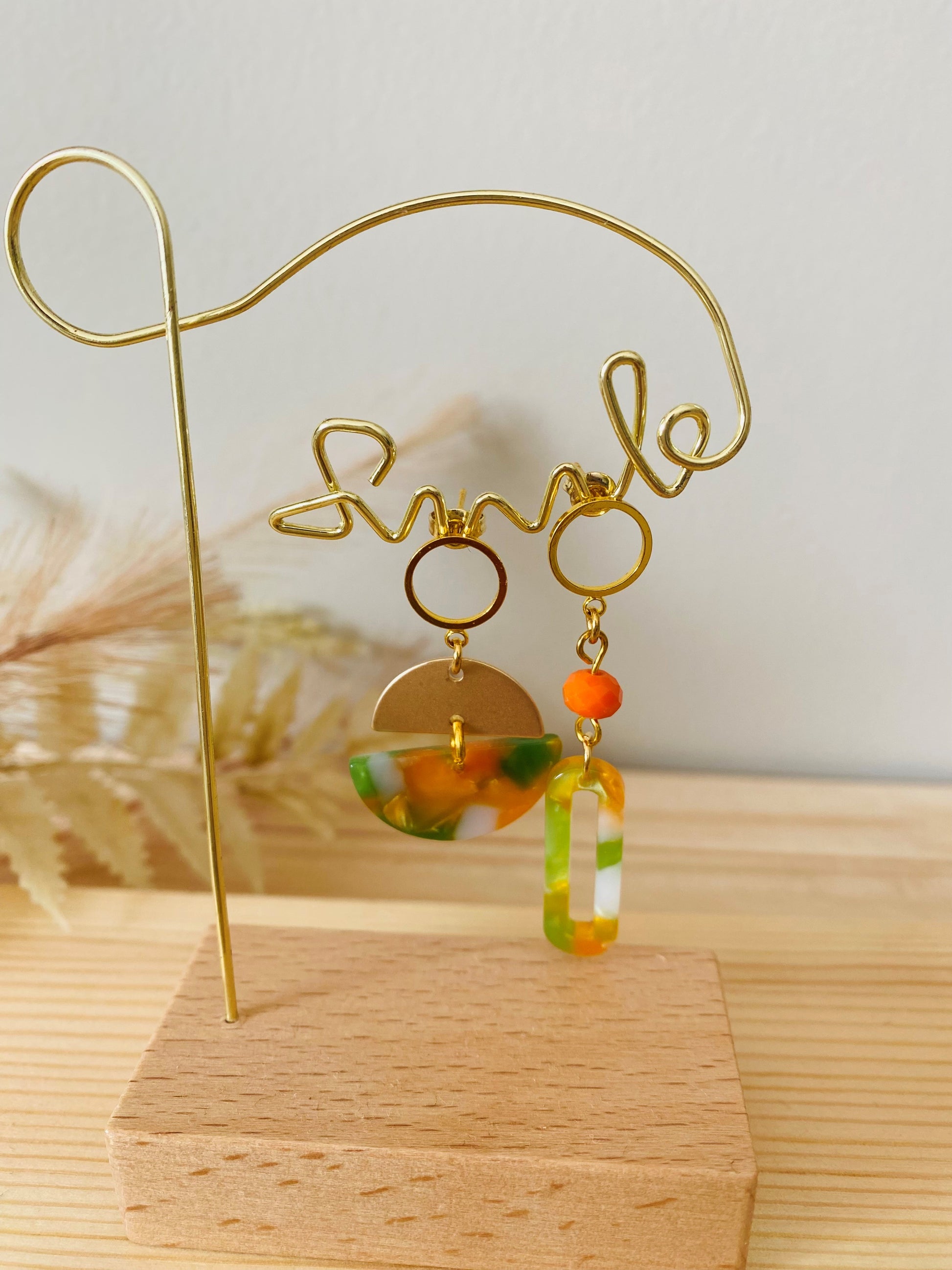 Elke oorbel is een kunstwerk op zich, met een harmonieuze mix van groene en oranje tinten, subtiel afgewisseld met warme gouden accenten. Het speelse, asymmetrische ontwerp geeft een moderne, creatieve touch aan je outfit en trekt gegarandeerd de aandacht.
